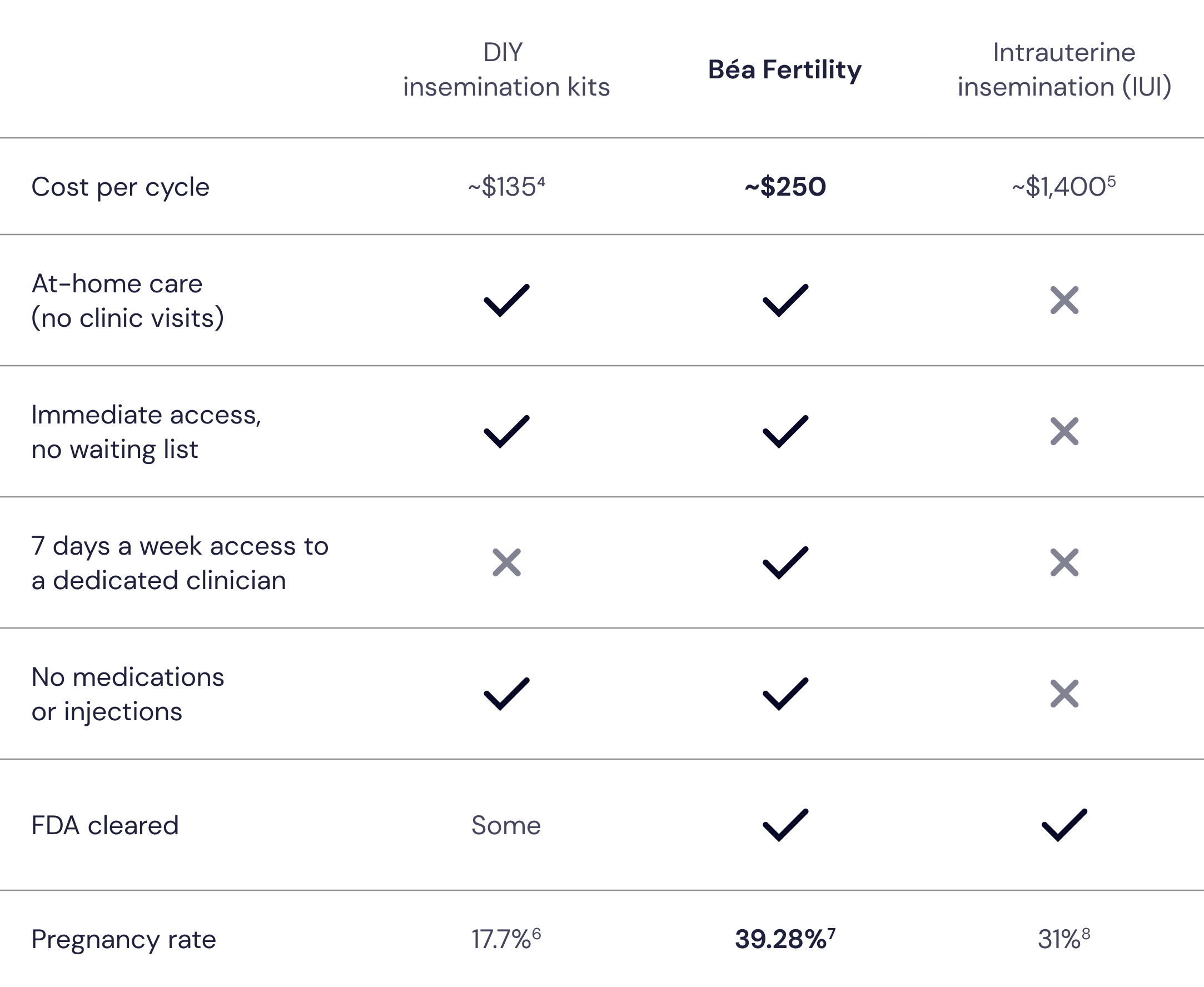 5. IUI success rates (31% over 3 cycles) from a limited New Zealand study with ovarian stimulation; actual results vary by age, diagnosis, sperm quality, and other factors (Farhi et al., 2017, PubMed 29174128). Béa’s internal report and the IUI study are from different sources and populations; interpret separately, not as a direct comparison.